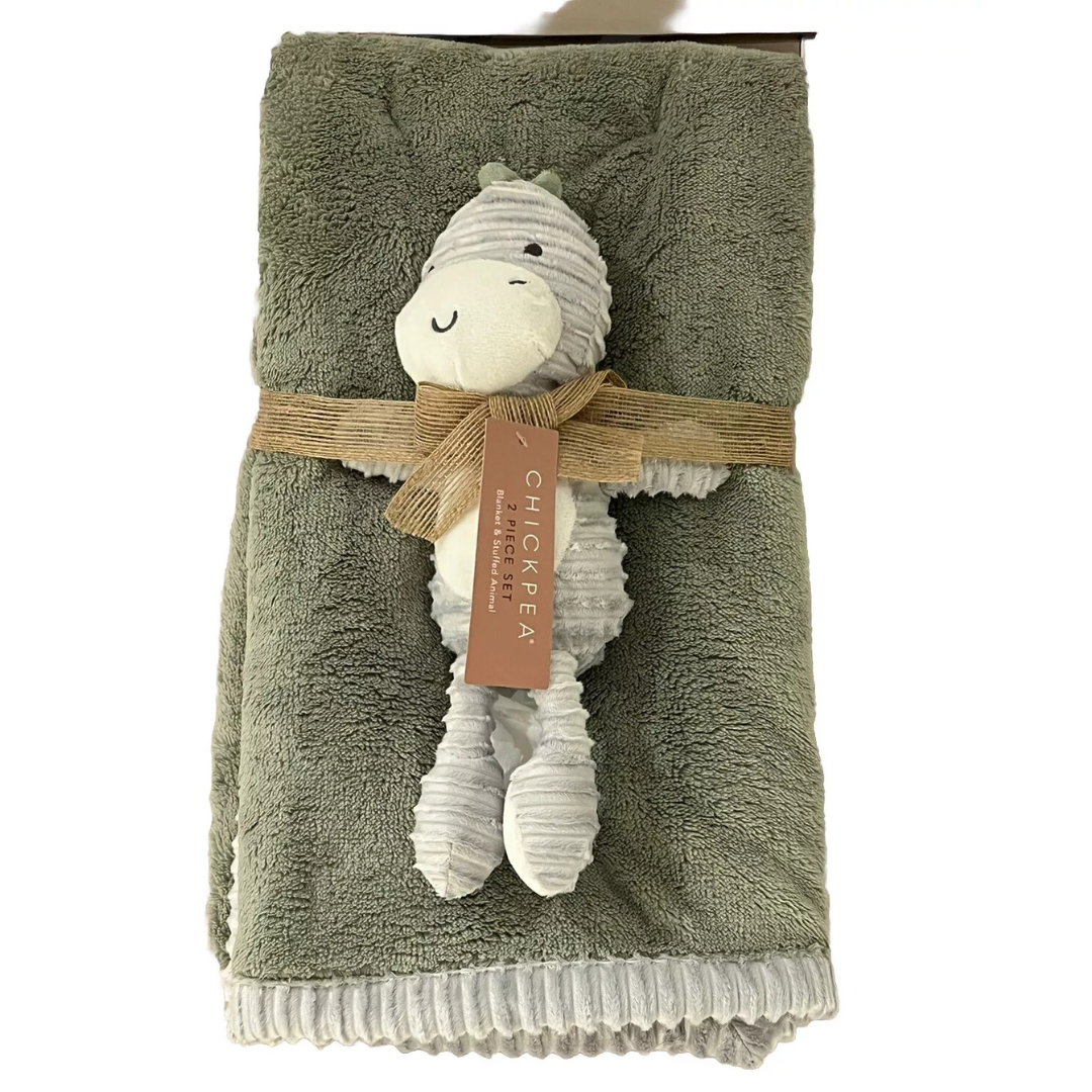 Set de 2 piezas que incluye una cobija súper suave 100% poliéster y un peluche de animalito.