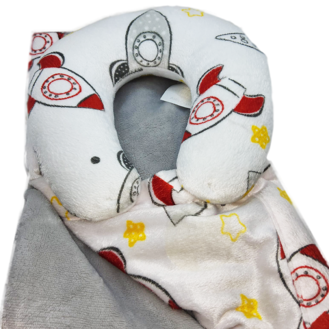 Cobija acolchada para bebé con estampado de naves espaciales. Incluye también una almohada para bebés.