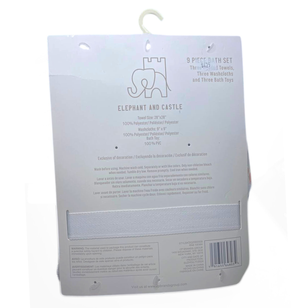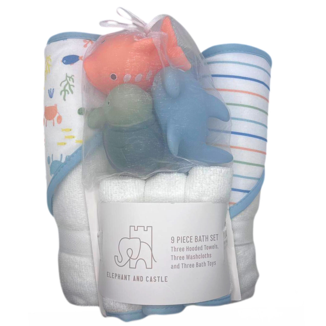 ELEPHANT AND CASTLE 3 Pzas De Toallas De Baño Con Capucha Blanco Con Azul Y Estampado De Animales Marinos, 3 Toallitas/Pañitos Y 3 Pzas De Juguetes De Hule