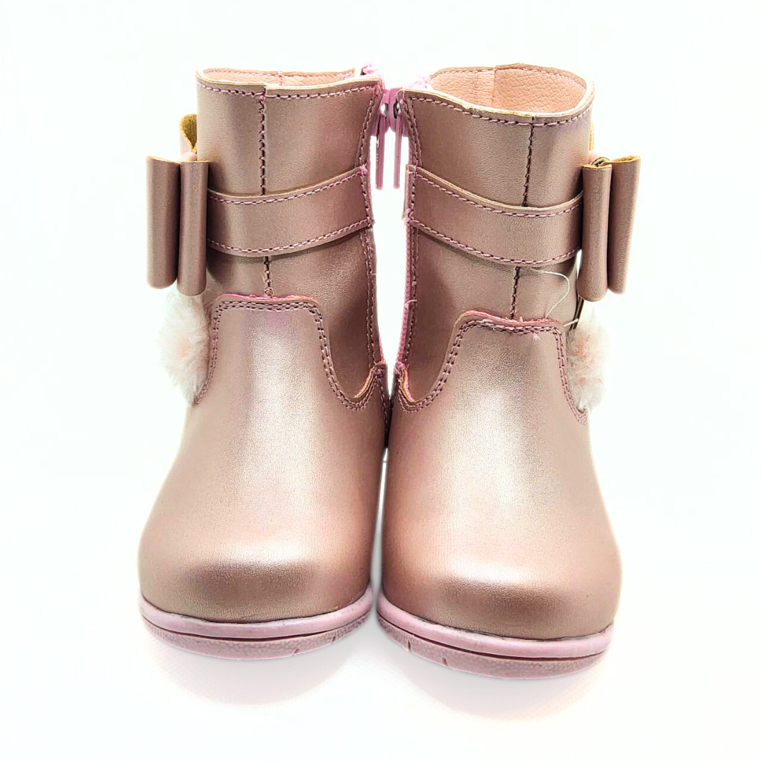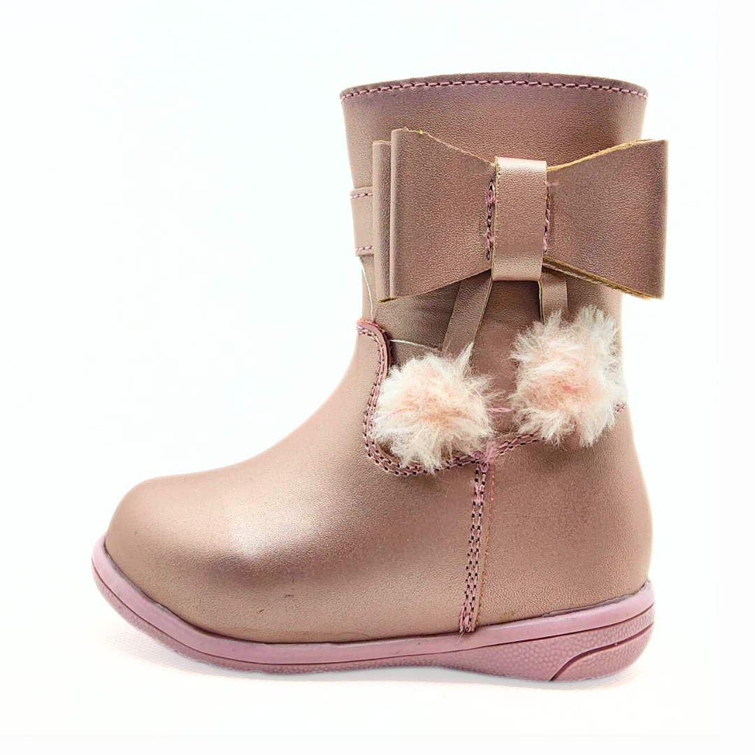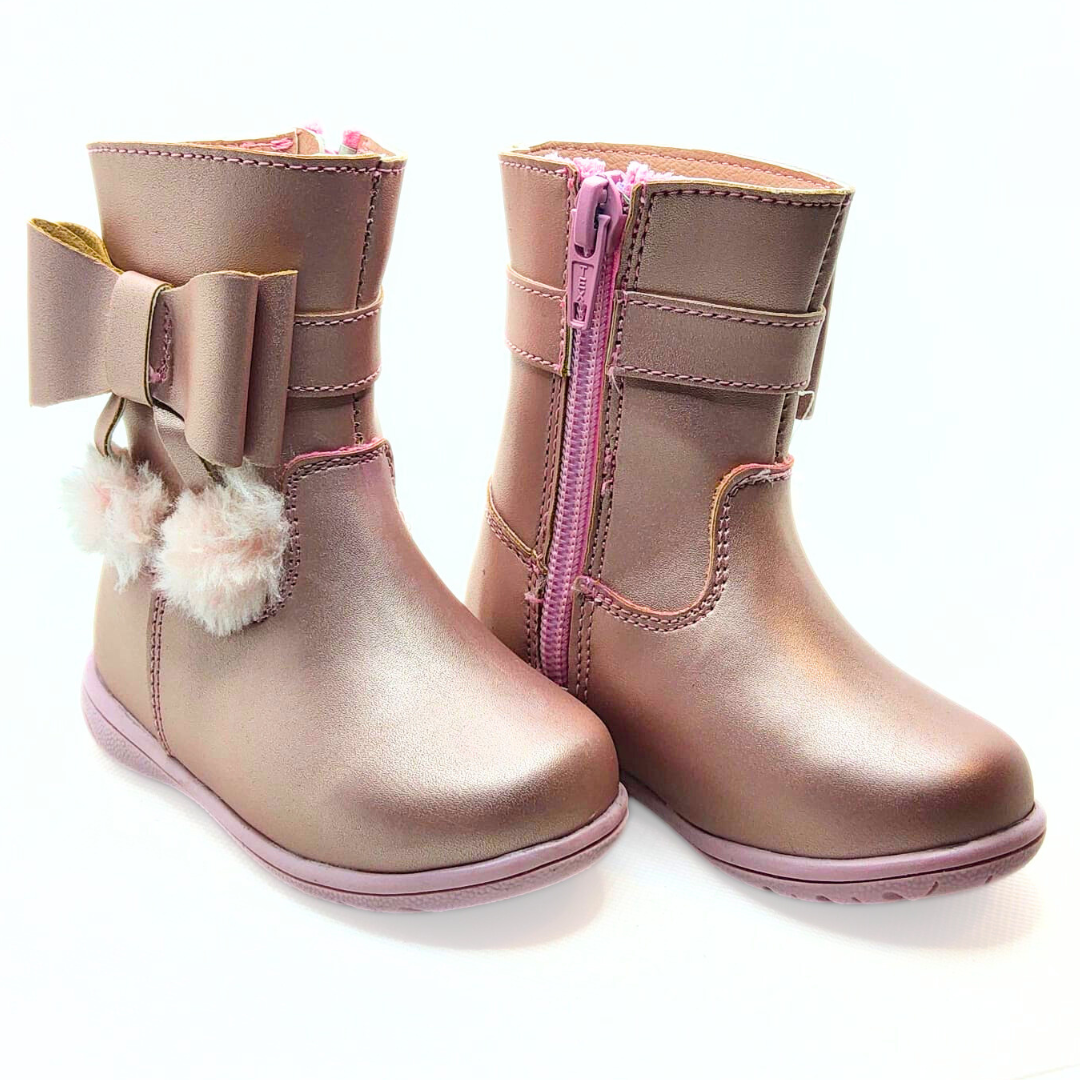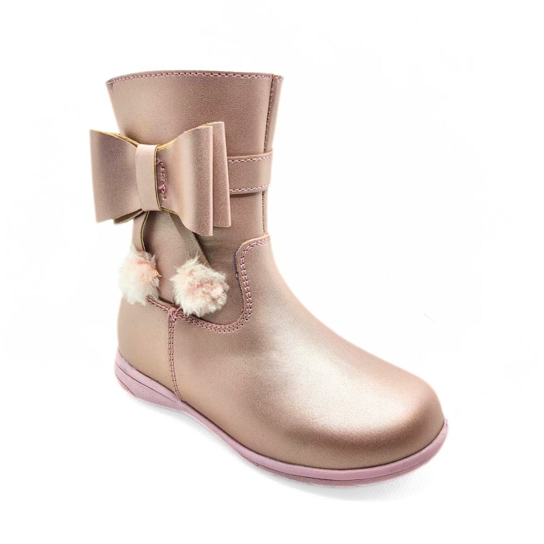 Estas botas para niña cuentan con un diseño elegante en tono metálico rosa, un lazo decorativo al costado y detalles de pompones que añaden un toque encantador. Su práctico cierre lateral facilita ponérselas y ajustarlas, haciéndolas ideales para el día a día o para ocasiones especiales. Perfectas para lucir con estilo en la temporada de frío.