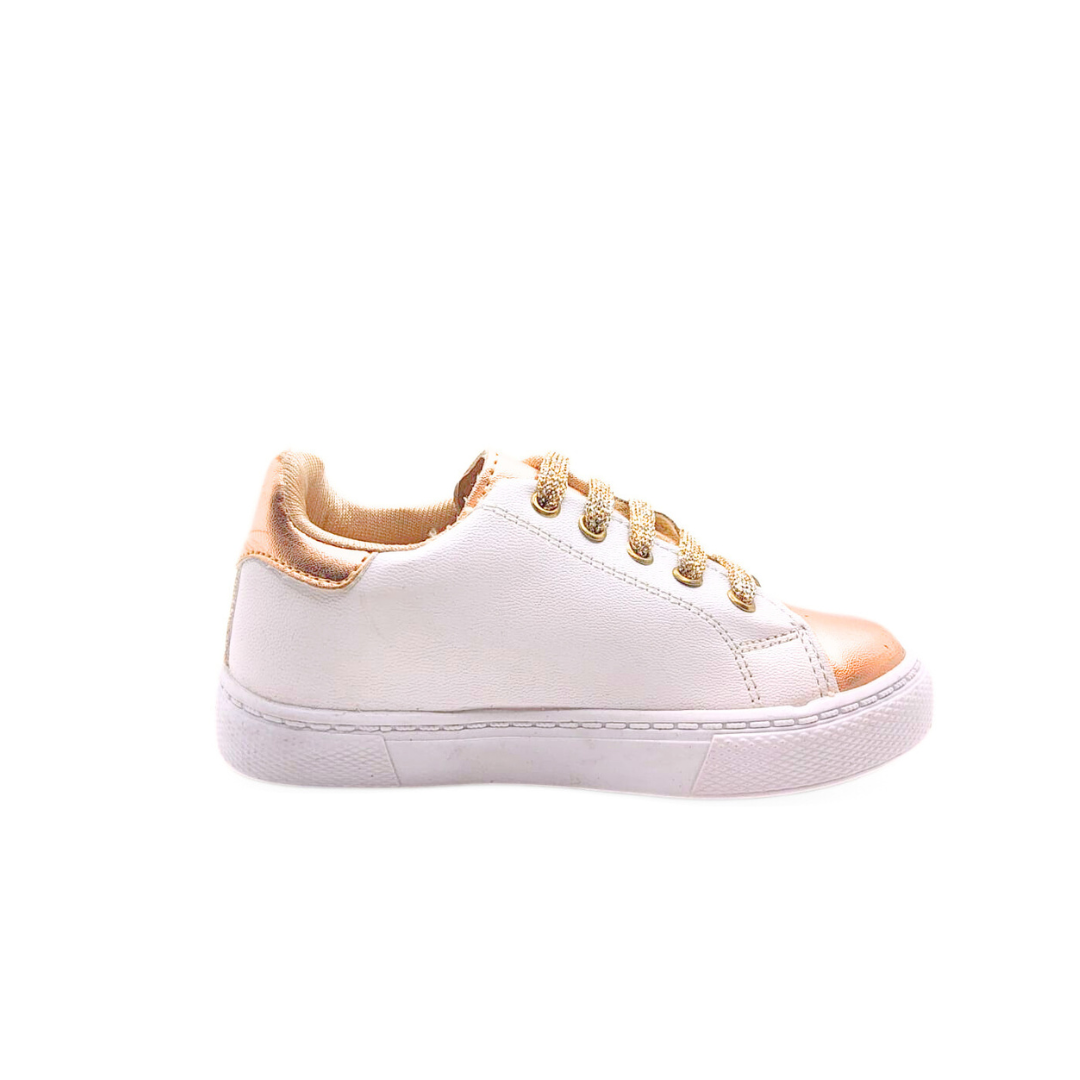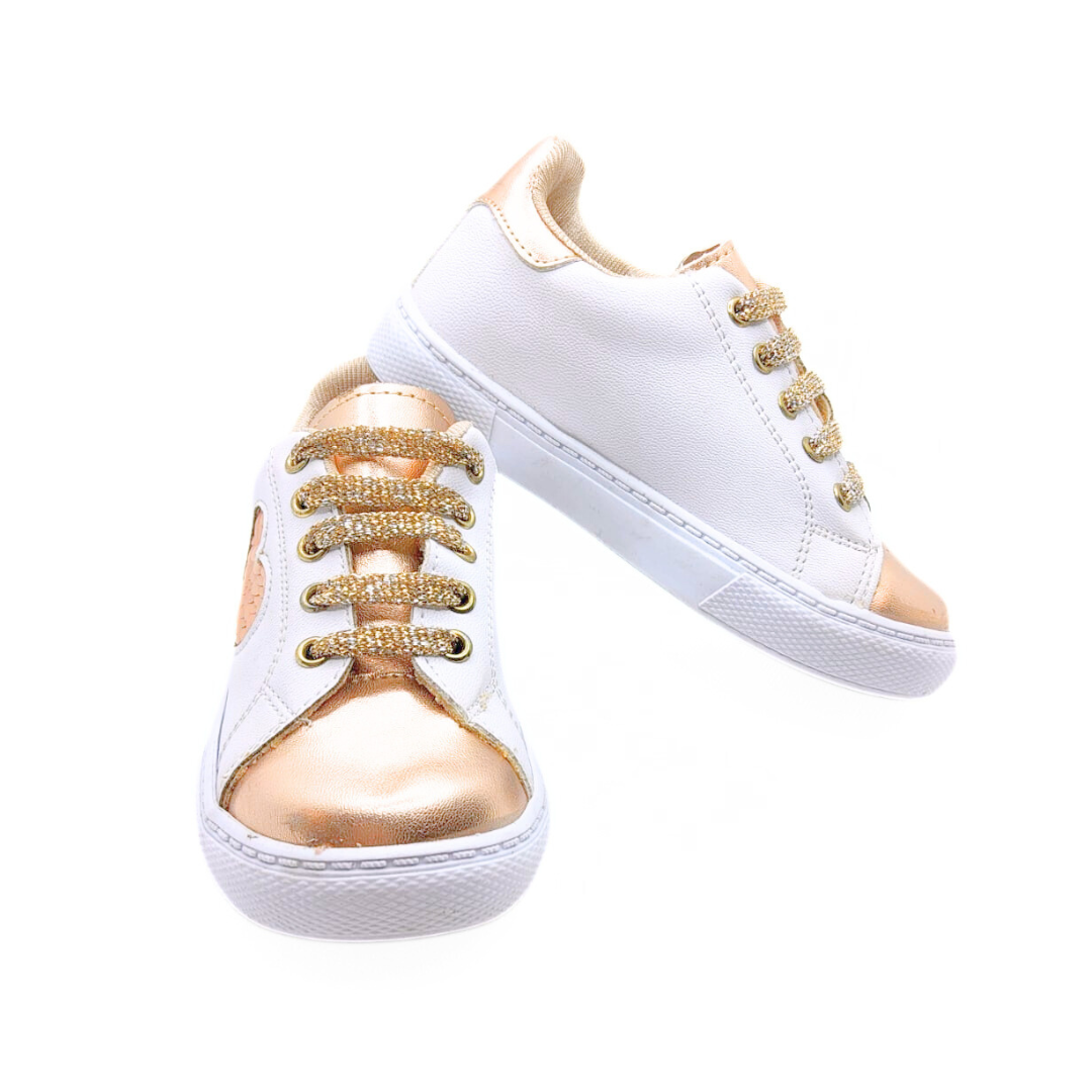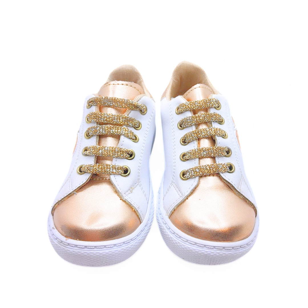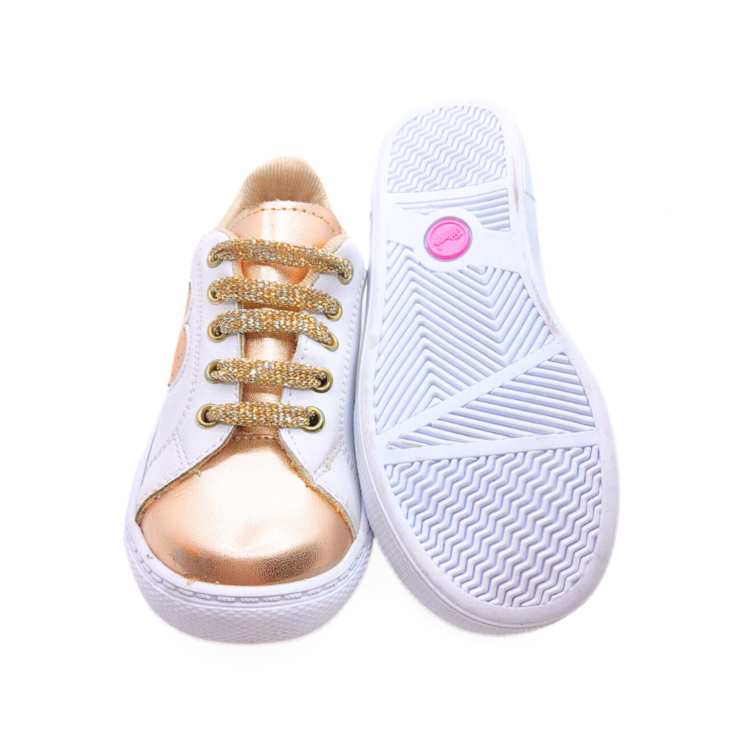 Tenis blanco con oro rosado y un toque multicolor. Son el calzado ideal para que tu pequeña luzca cómoda y fresca esta temporada de calor.