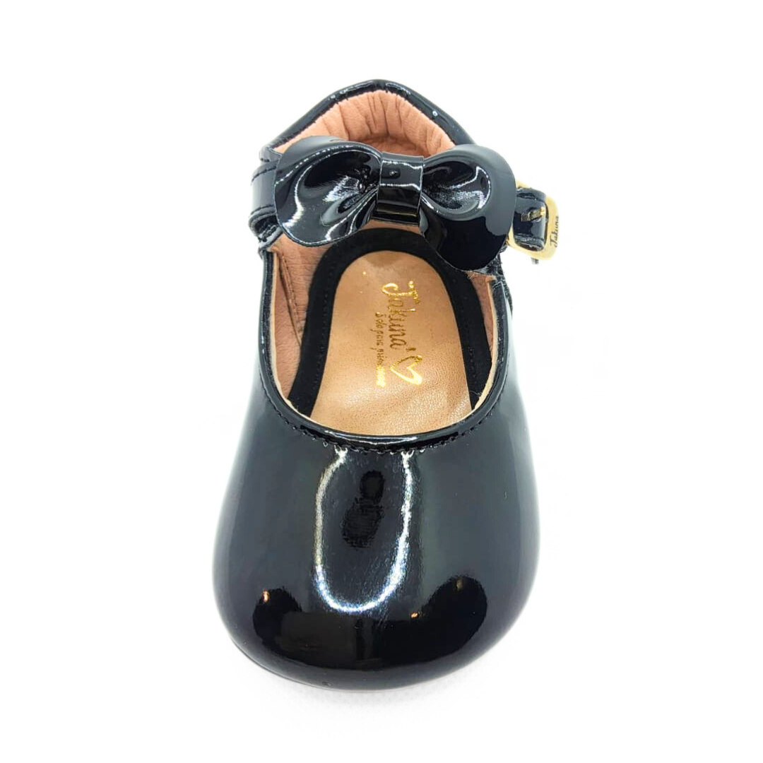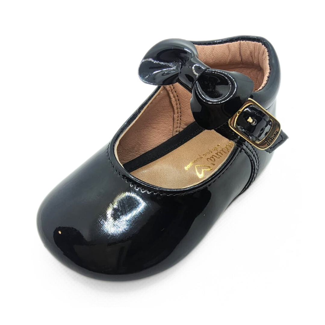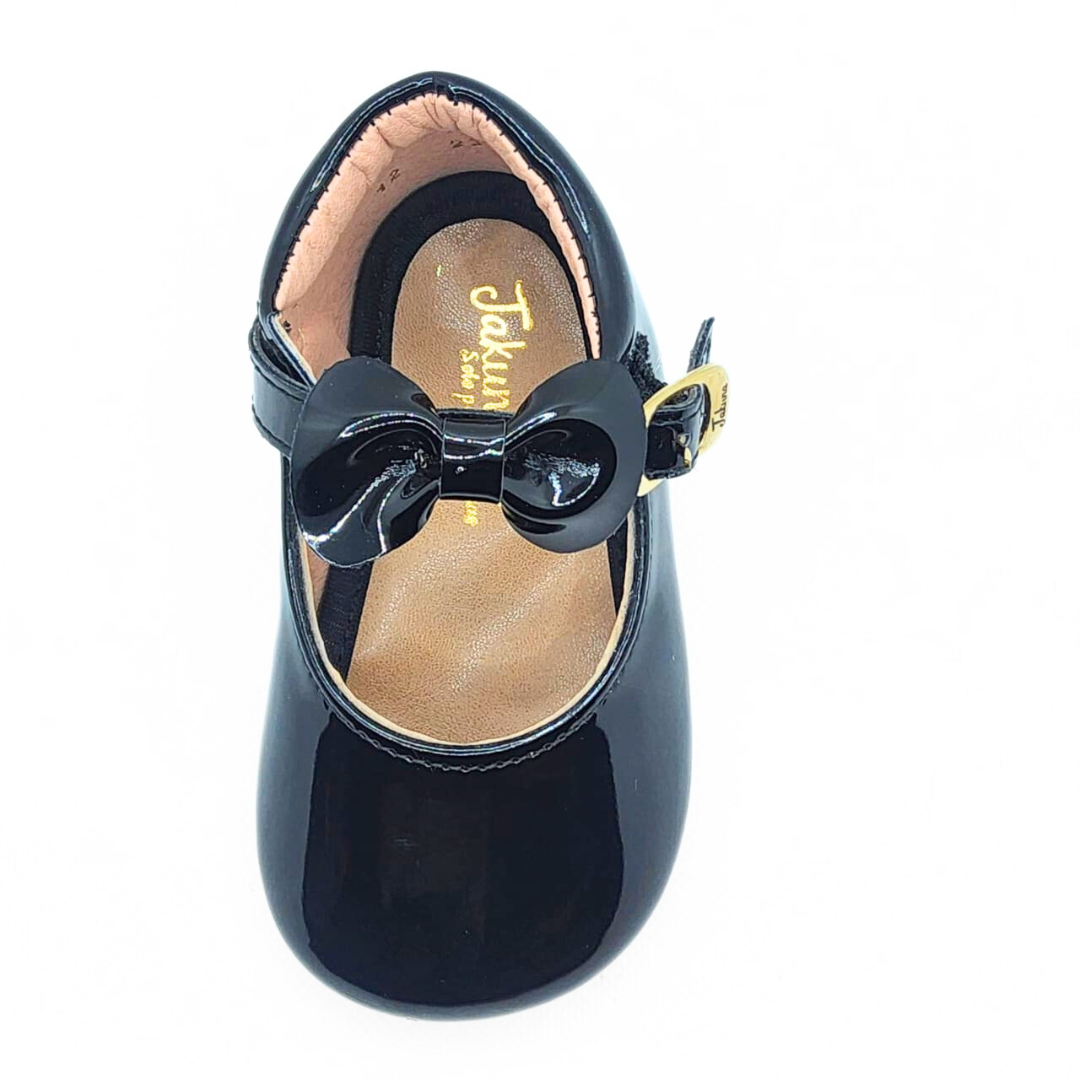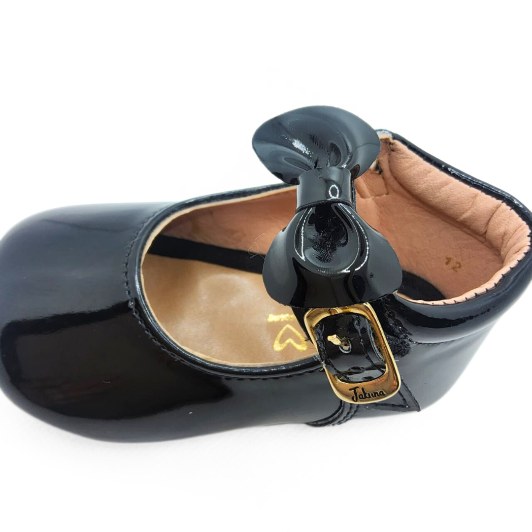 Zapato de charol negro con moño en la correa: un toque clásico y encantador para lucir con elegancia en cualquier evento especial.