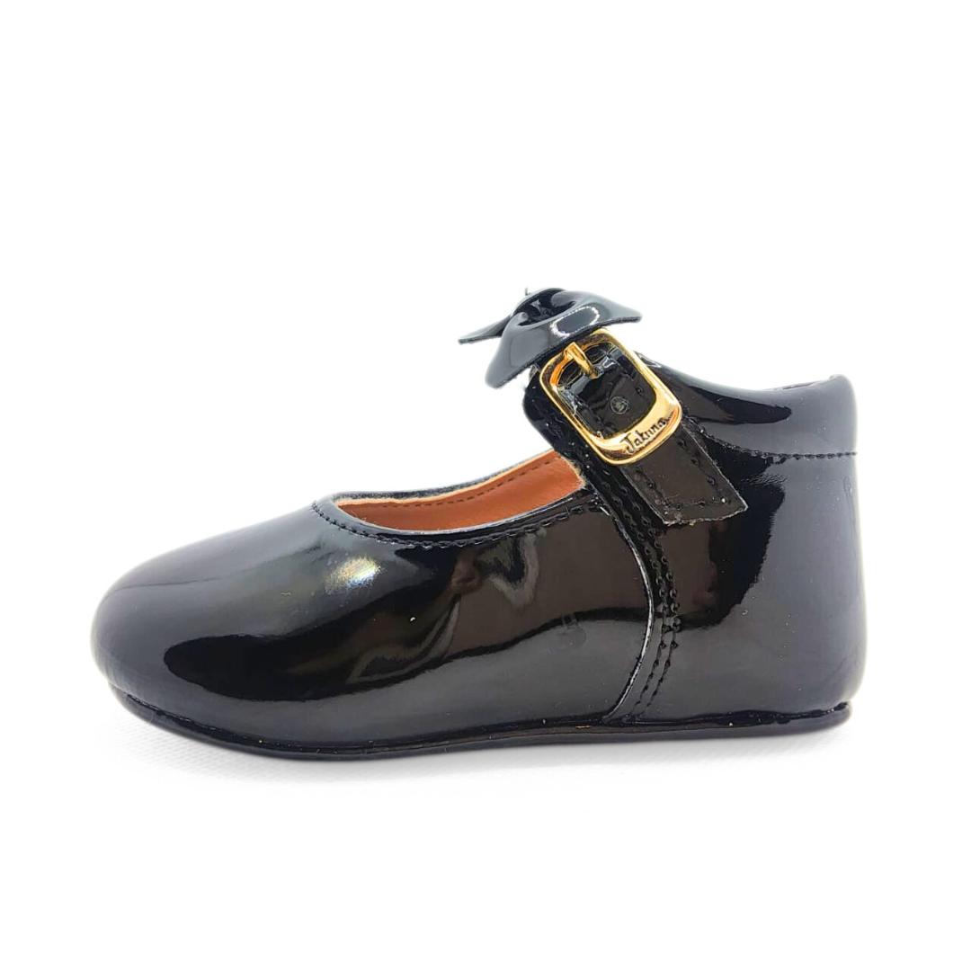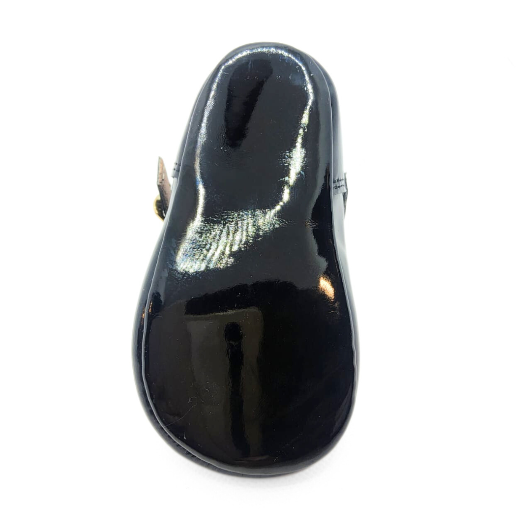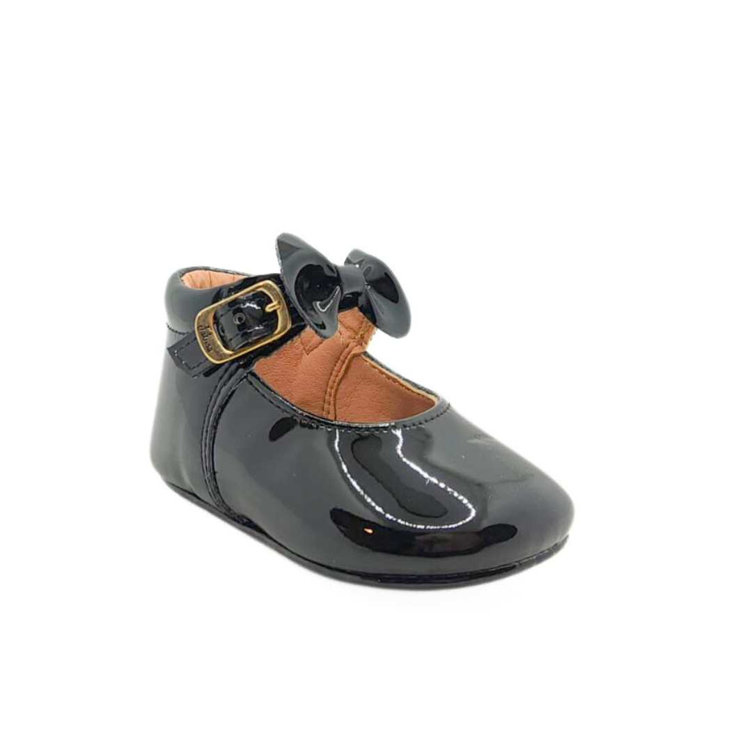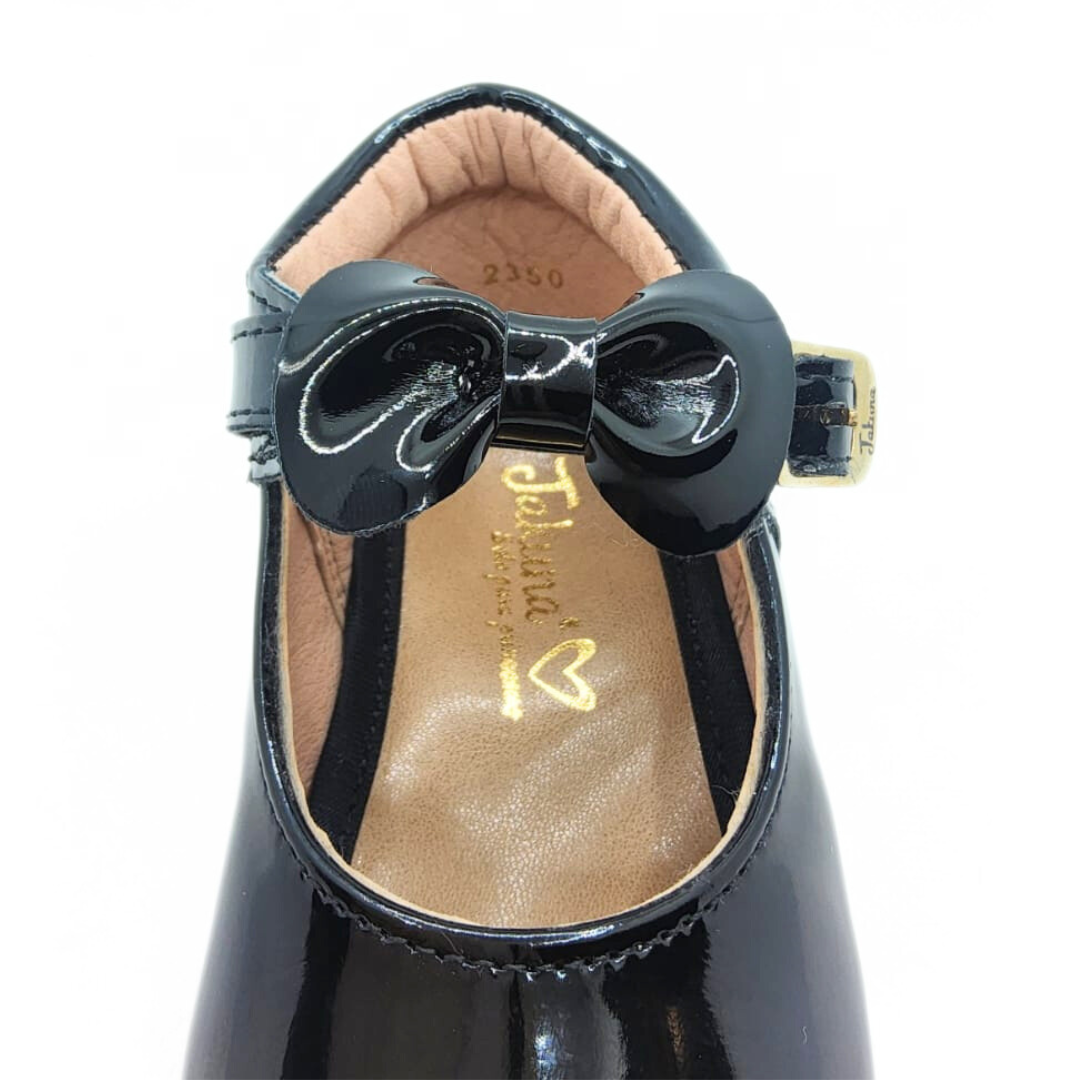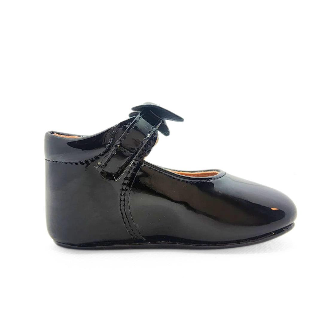 Zapato de charol negro con moño en la correa: un toque clásico y encantador para lucir con elegancia en cualquier evento especial.