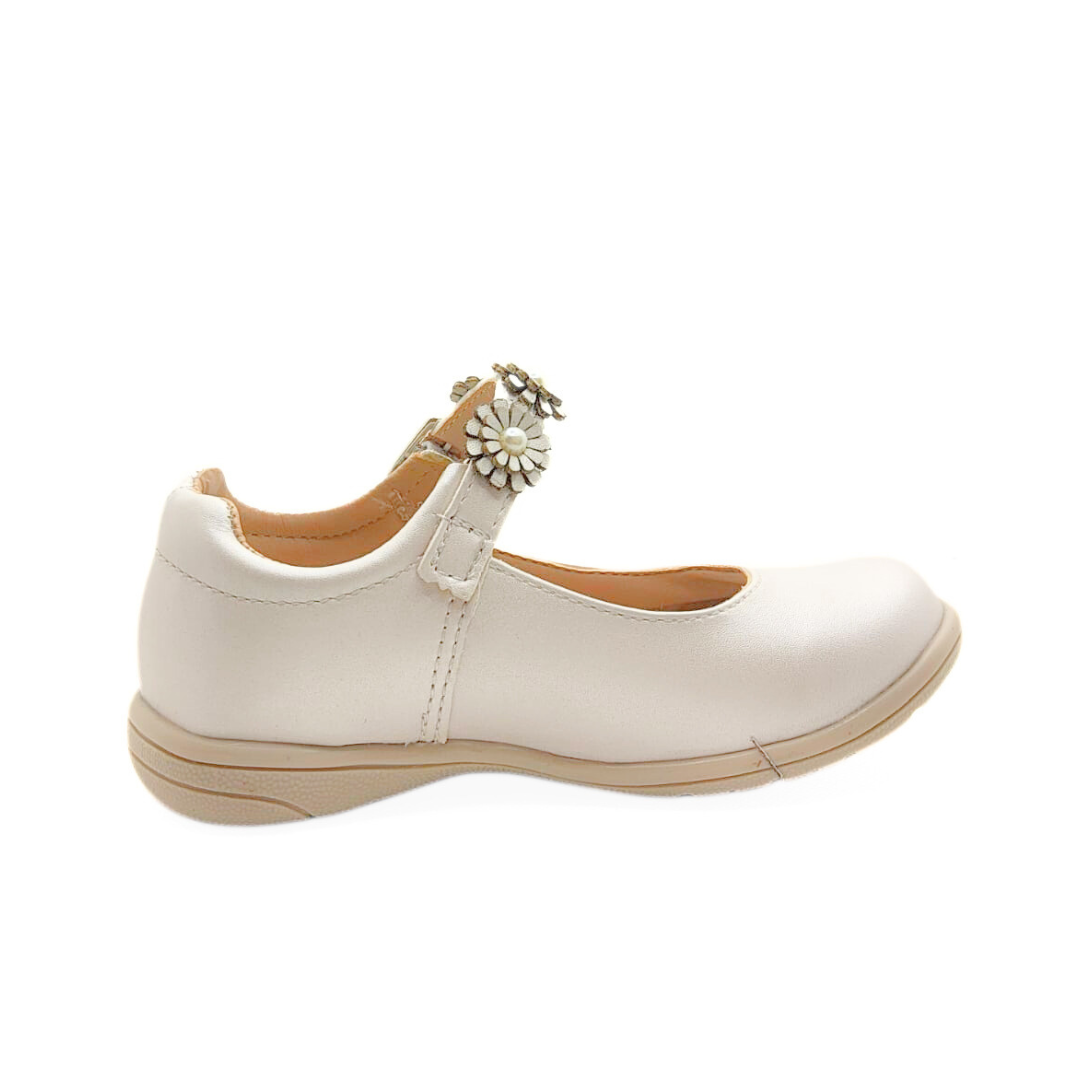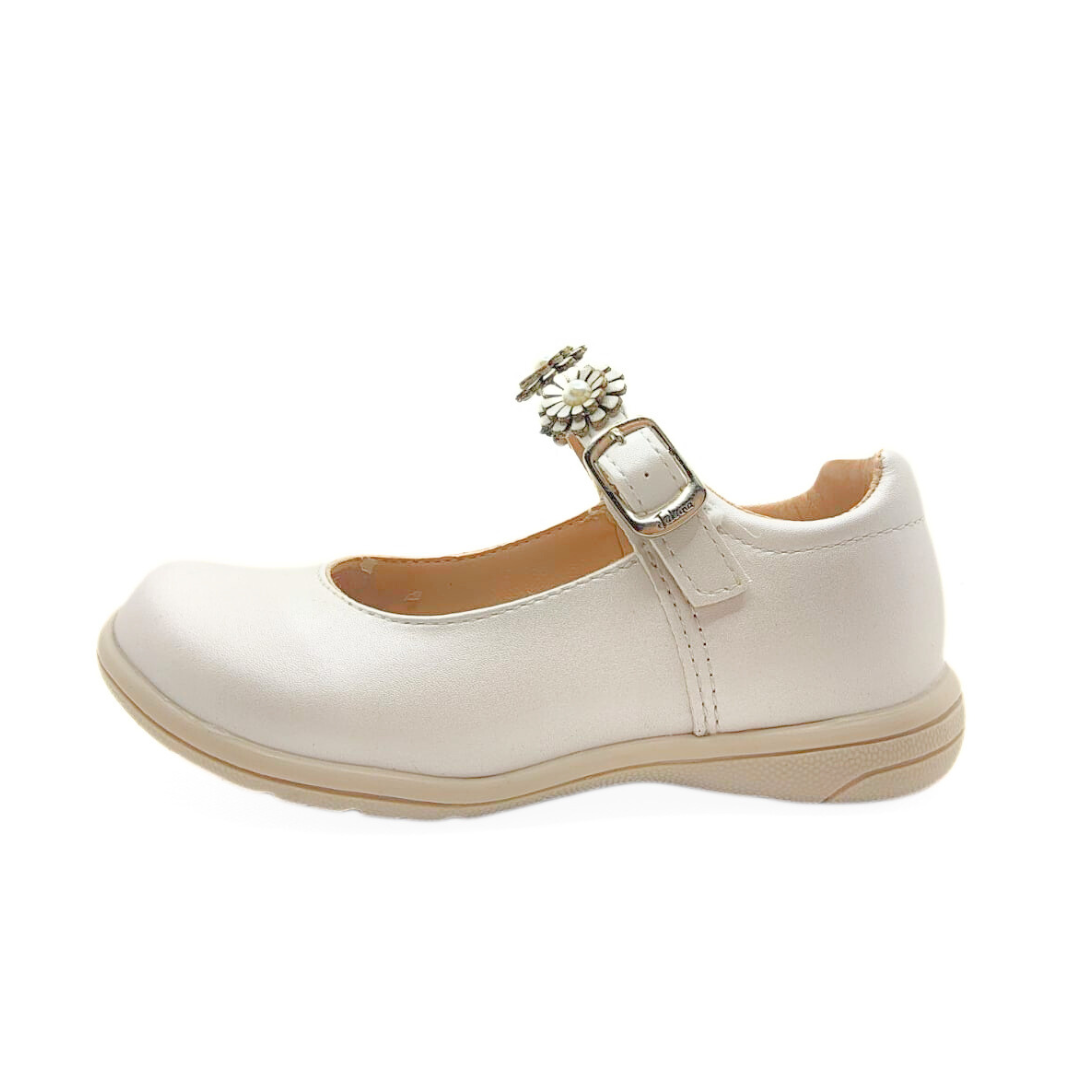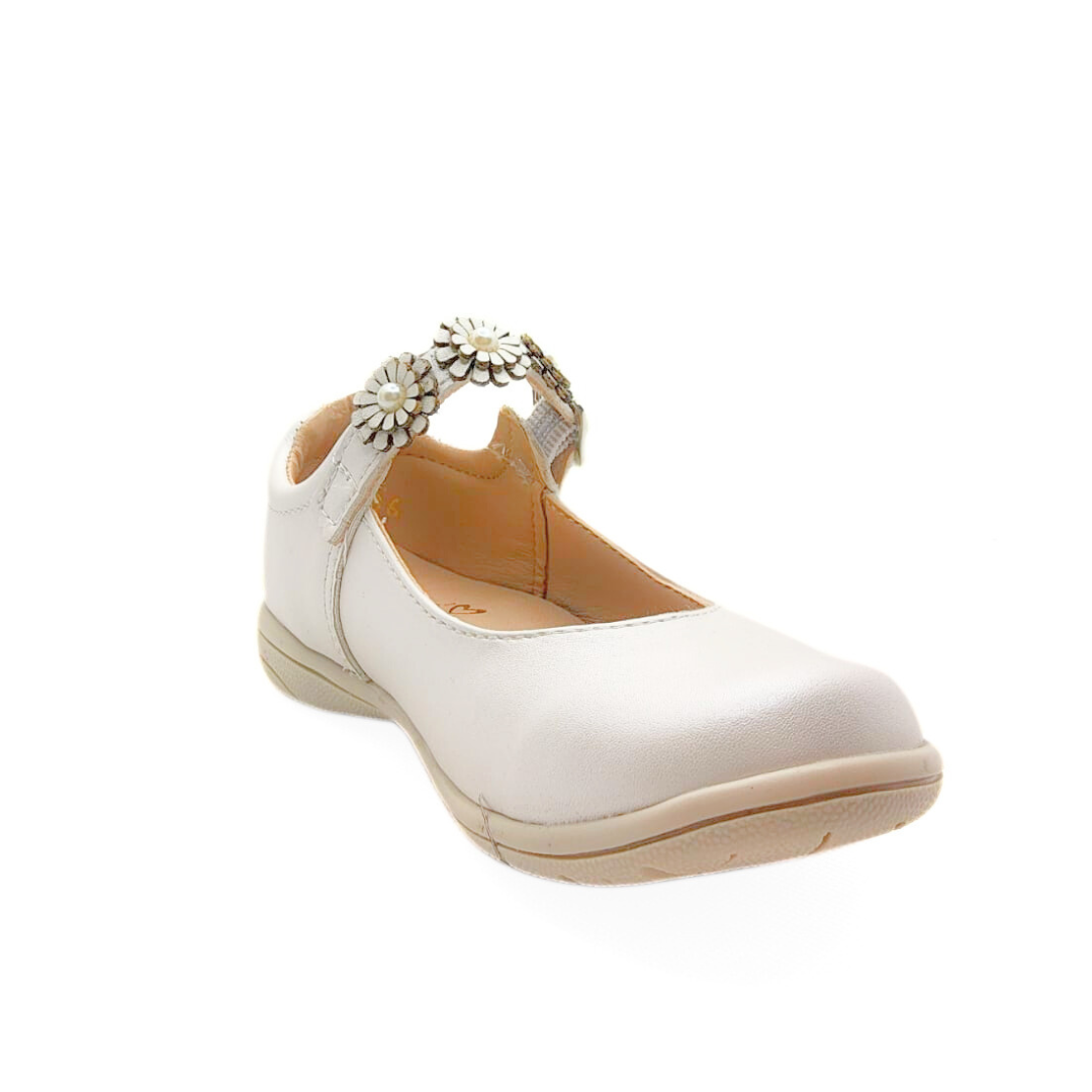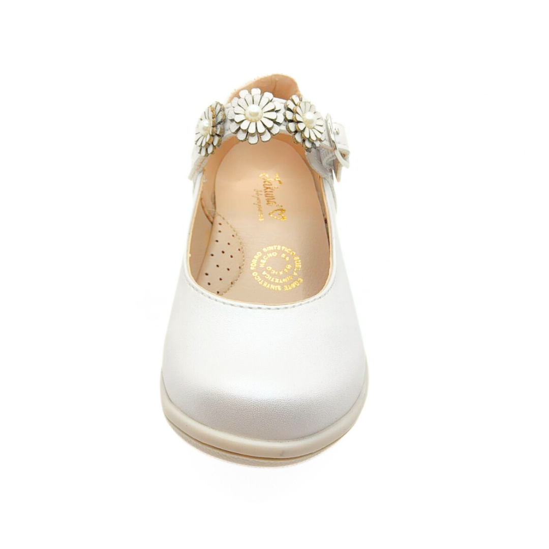 Zapatos blancos para niña con un diseño clásico y encantador. Destacan por su pulsera decorada con flores y perlas, perfectos para eventos especiales o para lucir sofisticada cualquier día. Comodidad y estilo en cada paso. 👧✨