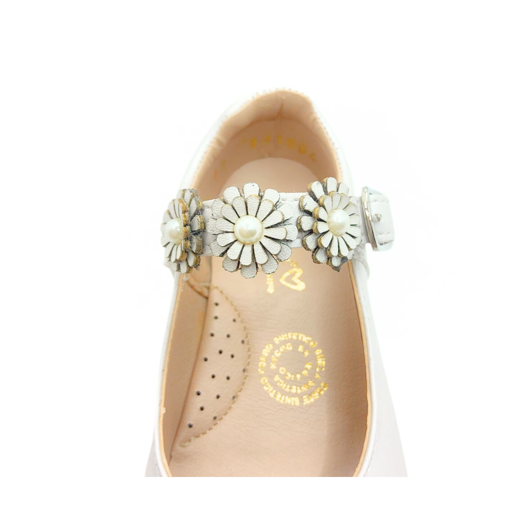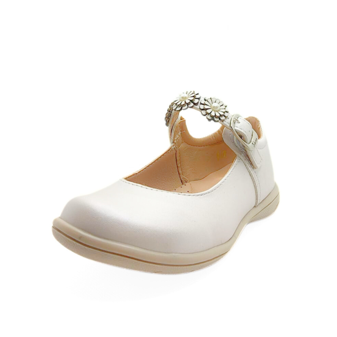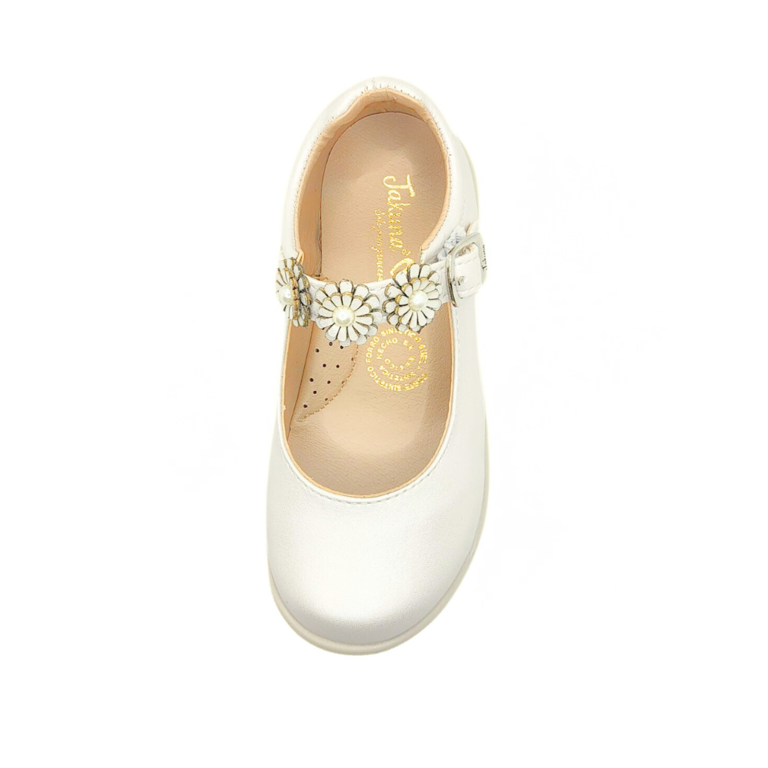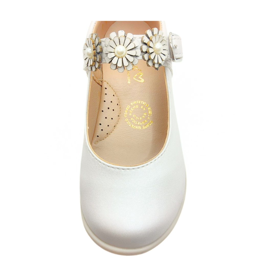 Zapatos blancos para niña con un diseño clásico y encantador. Destacan por su pulsera decorada con flores y perlas, perfectos para eventos especiales o para lucir sofisticada cualquier día. Comodidad y estilo en cada paso. 👧✨