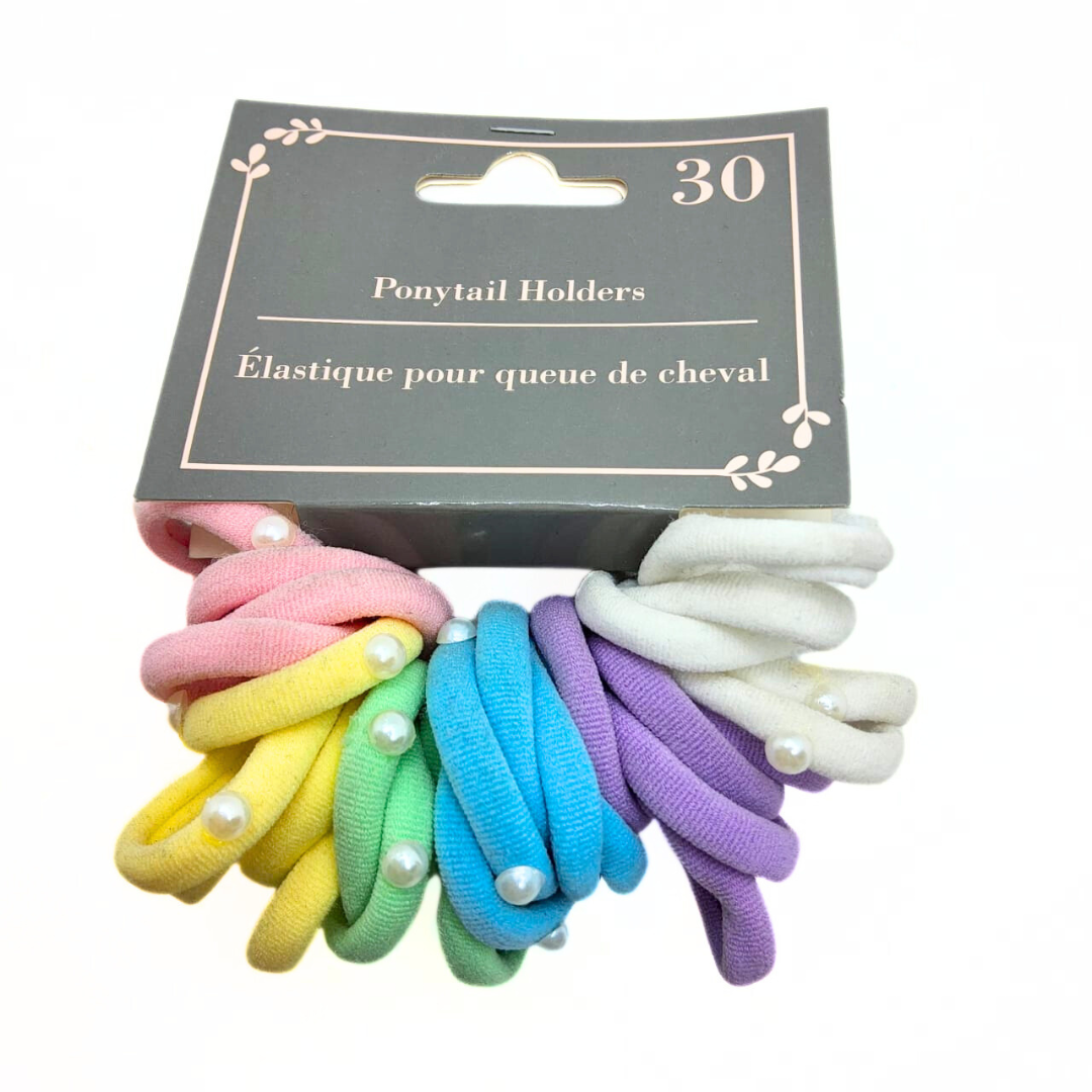 Set de 30 ligas en diferentes colores, adornadas con delicadas perlitas. Ideales para crear peinados variados y mantener el cabello recogido con estilo. Perfectas para uso diario o ocasiones especiales.
