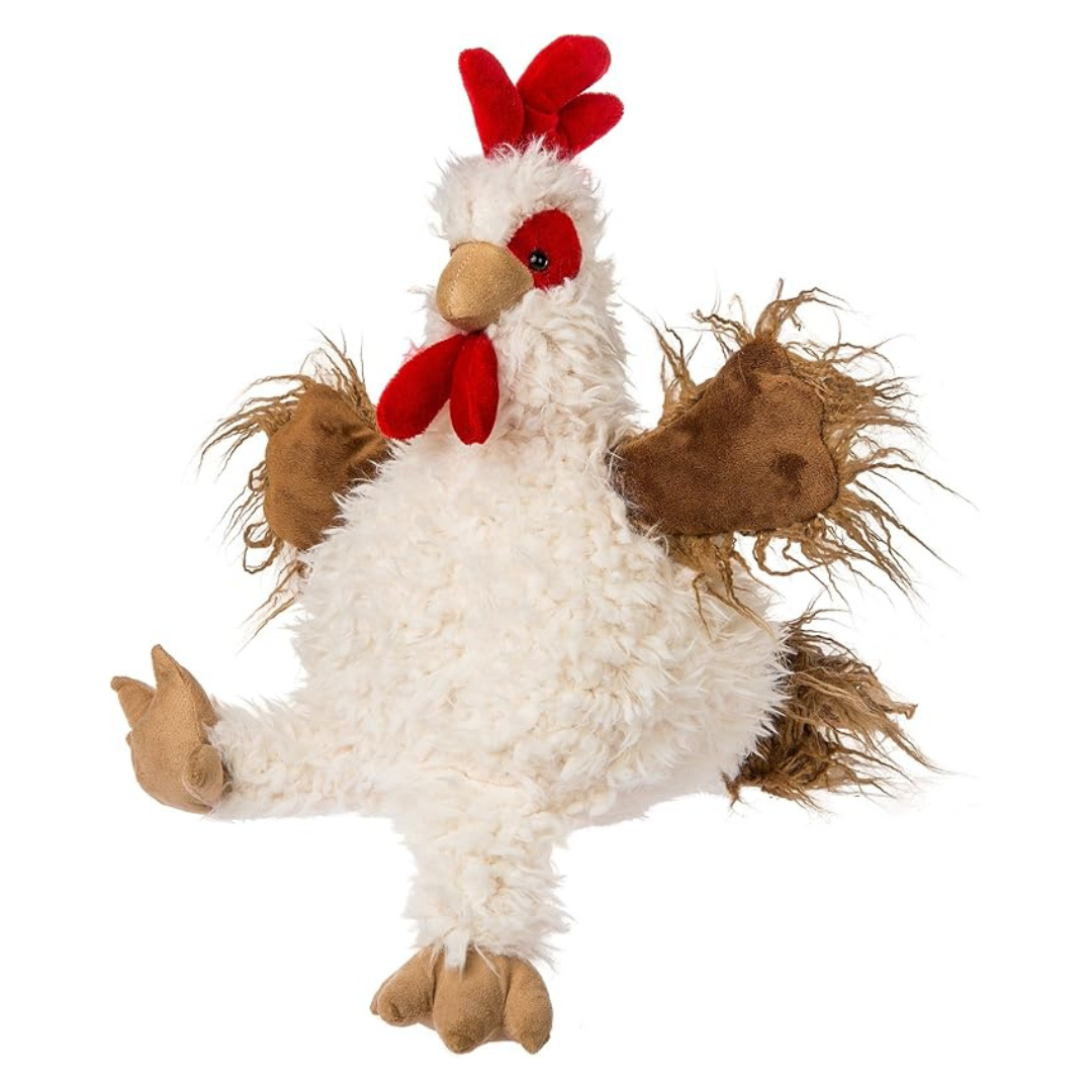 El gallo es un amigo suave y divertido con un cuerpo de tela blanca y una tela marrón más larga en las alas y la cola.