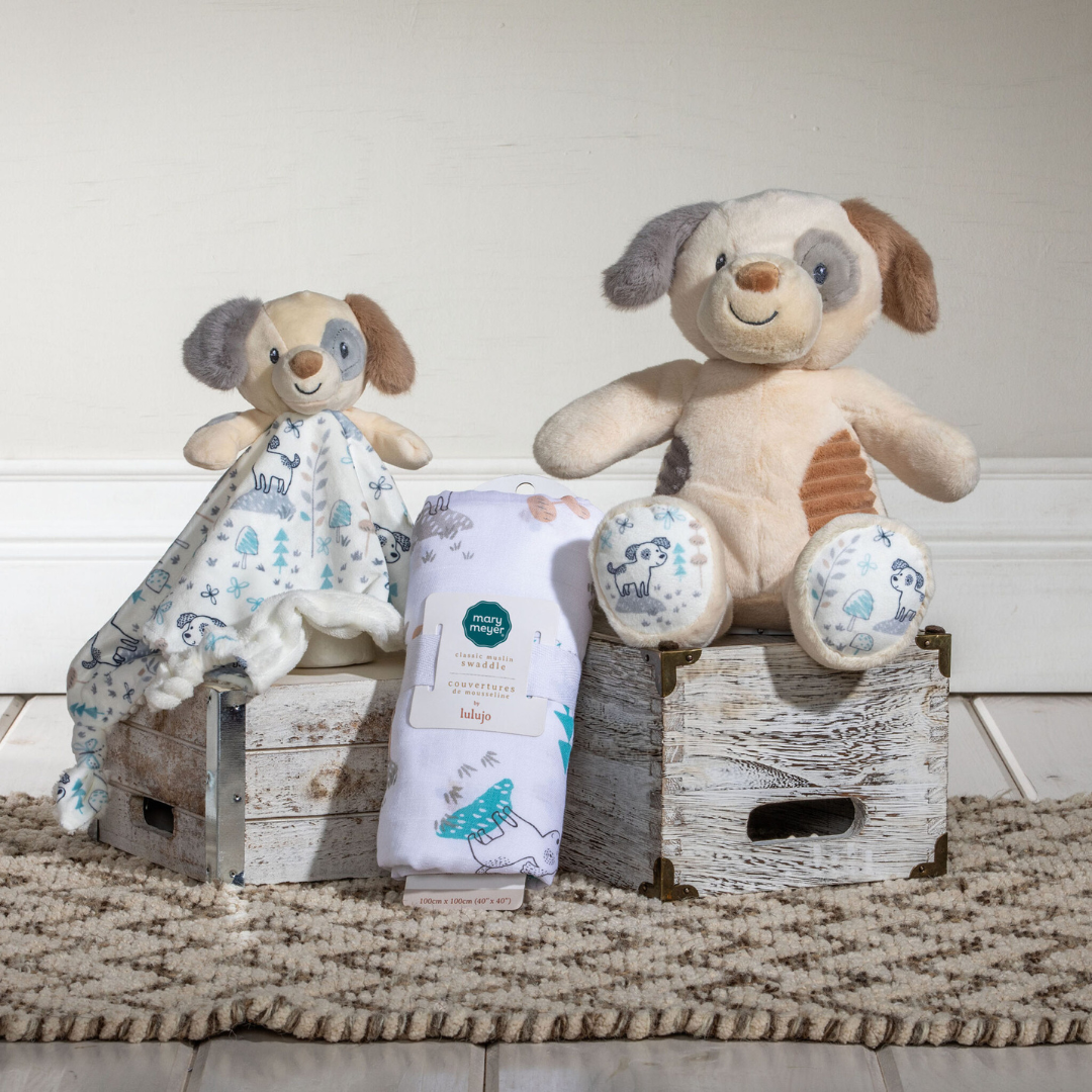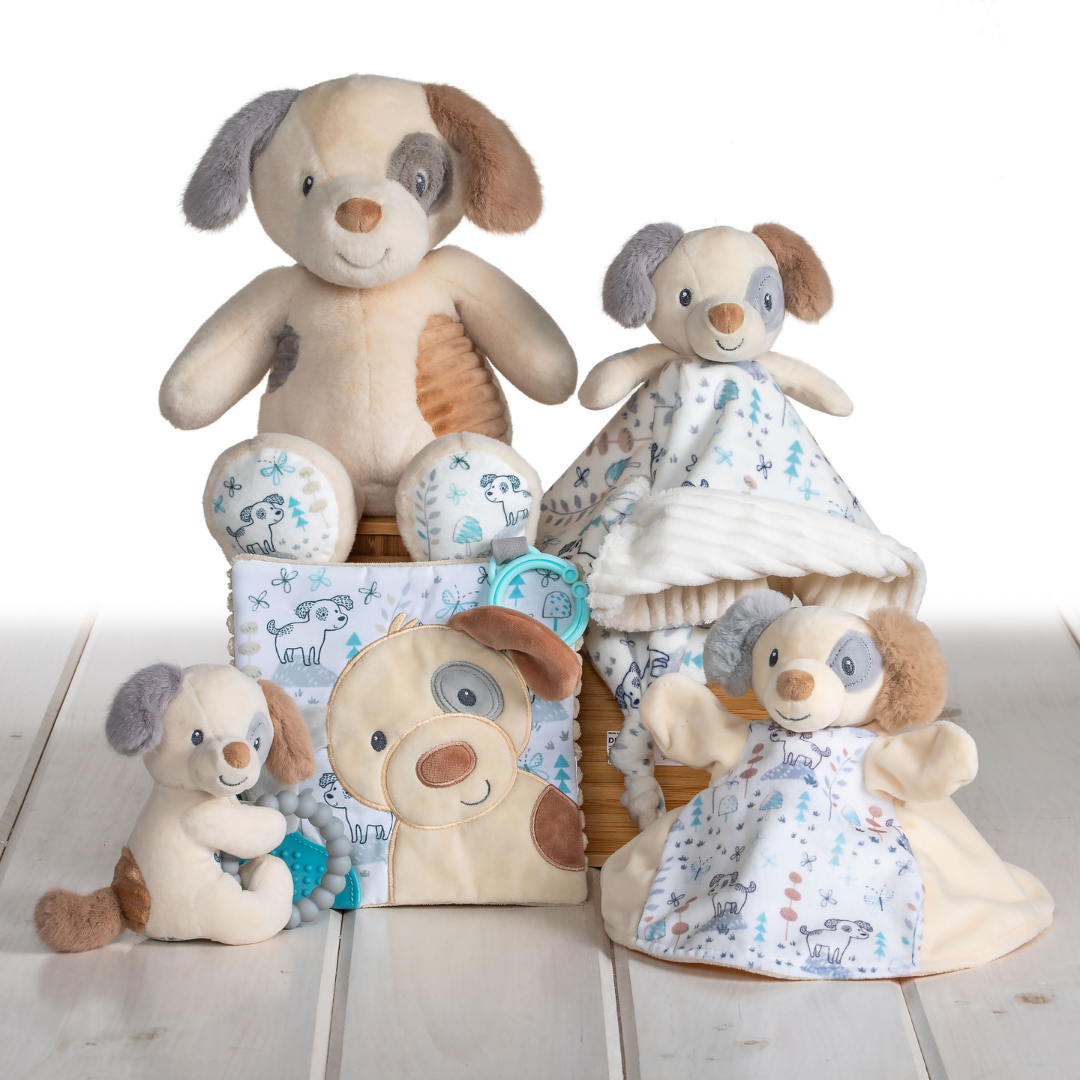 Los cachorros siempre son los favoritos y un gran éxito entre los más pequeños. Este amigo de cuatro patas en colores neutros, tela de textura suave y una gran sonrisa seguramente hará que algunas colas se muevan. La pareja perfecta: cachorro y bebé.