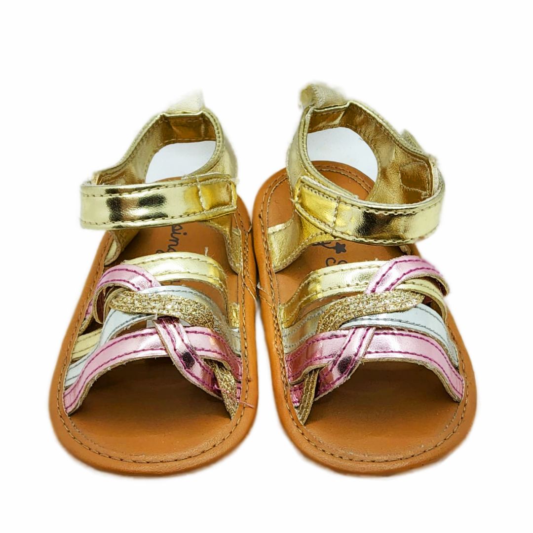 ¡La sandalia dorada perfecta para tu bebé! Con detalles de colores y un diseño moderno, esta sandalia es ideal para cualquier ocasión, combinando comodidad y estilo. ¡Tu pequeña brillará con cada paso!